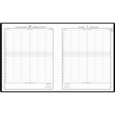 Agenda journalier planifiée assorti. Format : 18 x 22,5 cm. 12 mois Janvier à Décembre . 1 jour par page. Rendez-vous 1/4 d'heure par 1/4 d'heure Jusqu'à 6 utilisateurs. Reliure cousue. Couverture en plastique couleurs assorties.