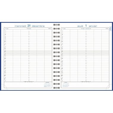 Agenda journalier spirale assorti. Format : 18 x 22,5 cm. 12 mois Janvier à Décembre . 1 jour par page. Rendez-vous par 1/4 d'heure de 7h à 21h45. Jusqu'à 6 utilisateurs. Reliure spirale. Couleurs assorties.