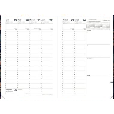1 semaine sur 2 pages à la verticale avec espace pour prise de note sur la page de droite. RDV par ½ heure de 8h à 21 h du lundi au samedi et de 8 h à 19 h le dimanche.