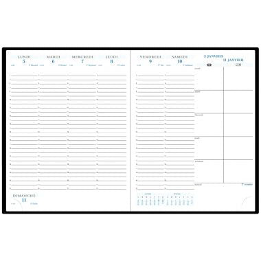 Agenda semainier Horizon 21x27cm noir. Format : 21 x 27 cm. 12 mois de Janvier à Décembre. La semaine sur 2 pages à la verticale avec RDV par 1/2 heure de 7h à 21h Des cases larges pour les faits importants , téléphones, notes. Répertoire amovible avec onglets alphabétiques. Coins détachables. Répertoire. Atlas. Couverture noire en plastique amovible.