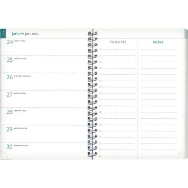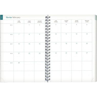 Agenda semainier Mini labo 15x21 Blanc. Format 15x21cm 12 mois, de Janvier à Décembre Semaine sur une page à l'horizontale + page de note et to-do list Calendrier mensuel chaque début de mois Reliure spirale Couverture carton imprimé