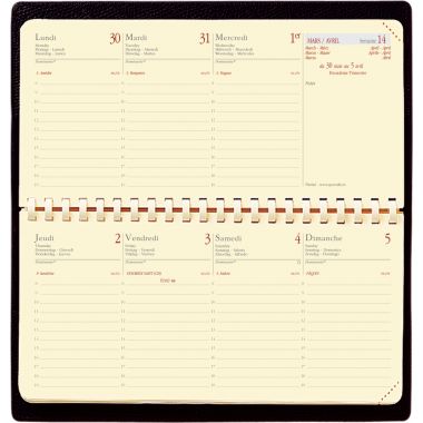 Agenda semainier Planital 8,8x17cm noir. Format : 8.8 x 17 cm. 12 mois de mi décembre à décembre. La semaine sur 2 pages. Format long spiralé à l'italienne. Papier ivoire. Impression bicolore gris et garance. Pages d'informations pratiques. Atlas couleur. Sans Répertoire . Couverture en plastique grainée noire.