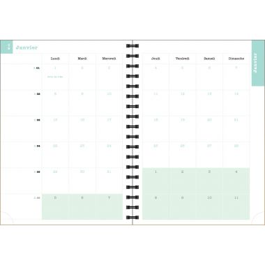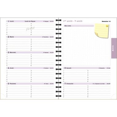 Agenda semainier Sophie 15x21cm violettes. Format : 15x21cm. 12 mois de janvier à décembre. 1 semaine sur 2 pages à l'horizontale avec espace de notes sur la pages de droite. 1 pochette de rangement plastifiée. Pages de plannings + pages pour prise de notes. Reliure spirale. Grille horaire de 7h à 20h. Coins ronds détachables. Élastique de fermeture. Couverture cartonnée imprimée.