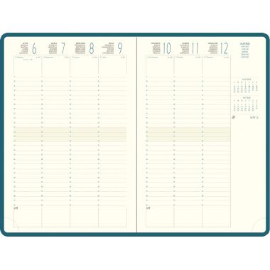 Agenda semainier Volga 16x24cm bleu canard. Format : 16 x 24 cm. 12 mois de Janvier à Décembre. La semaine sur 2 pages à la verticale. Papier ivoire impression bleu. 7 jours complets. Multilingue. Couverture en matière plastique lisse. Prise de RDV par demi heure de 7h à 21h du lundi au dimanche, feuilles pour planning, 1 page pour prise de note. Coins détachables. Répertoire.
