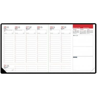 Agenda semainier Voyage 16x16cm noir. Format : 16 x 16 cm. 12 mois de janvier à décembre. 1 semaine sur 2 pages à la verticale avec espace pour prise de notes sur la page de droite. Prise de rdv par ½ heure de 7h à 21 h du lundi au dimanche. Planning + pages pour prises de notes, cartes. Reliure cousue. Poche porte-cartes et documents. Coins perforés détachables. Couverture brillante en toile enduite façon cuir.