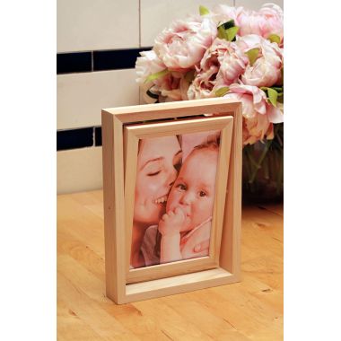 Cadre pivotant en bois recto/verso. Structure en bois, emplacement photos en plastique. Cadre rectangulaire pivotant pour 2 photos recto/verso, à décorer et à poser. Format portrait ou paysage. Épaisseur de 3 cm idéale pour le poser sans pied. Dimensions du cadre : L.19,5 x l.15 x ép.3 cm. Dimensions photos : 9 x 13 cm.