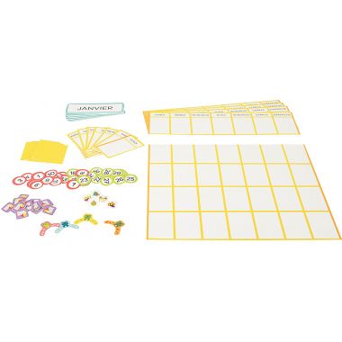 Calendrier magnétique à construire. Niveaux : MS - GS. Les activités rituelles sont conçues pour rendre concrets la succession des jours de la semaine et leur aspect cyclique. Les enfants déplacent la grenouille qui saute de jour en jour, retournent les jetons des jours écoulés, associent les jetons-événements aux dates régulières ou ponctuelles dans le mois (anniversaires, fêtes, sorties, maison, etc.). Ils apprennent à dire la date du jour et acquièrent peu à peu des repères dans le passé et le futur. COMPÉTENCES DÉVELOPPÉES : Se repérer dans la semaine, dans le mois. Situer des événements à venir ou passés. Associer un événement régulier à un jour de la semaine. Situer la journée par rapport à un temps proche (hier et demain), par rapport à la semaine. Se situer dans le calendrier pour établir la date du jour. Contenu : 1 livret pédagogique 4 bandes magnétiques semaine (42,5 x 12 cm) 1 support magnétique quadrillage (42,5 x 36,4 cm) 12 étiquettes-mois (17 x 5,5 cm) 14 étiquettes indépendantes jours de la semaine (6,5 x 12 cm) 35 jetons-quantièmes recto verso (Ø : 3,5 cm) 4 jetons-grenouille (5,5 x 3,7 cm) 5 jetons-événement, 20 jetons-maison et 15 jetons personnalisables (2,6 x 2,8 cm) 7 jetons neutraliseurs (5,5 x 8,6 cm). Dès 4 ans.