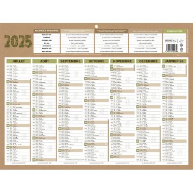 Calendrier Natura médium 32x42cm. Format : 32 x 42 cm. 7 mois sur chaque face. Congés scolaires et numérotation des semaines. Lunaisons. Imprimé et contrecollé sur papier et carton recyclés.