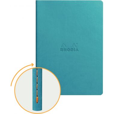 Carnet piqué 64 pages RHODIARAMA format A5, ligné, bleu turquoise. Format A5 (14,8x21 cm). Papier vélin velouté ivoire 90g. Couverture souple en simili cuir italien avec logo Rhodia embossé et piqûre textile orange cousue main. Page de garde orange. Ouverture à plat 180°.