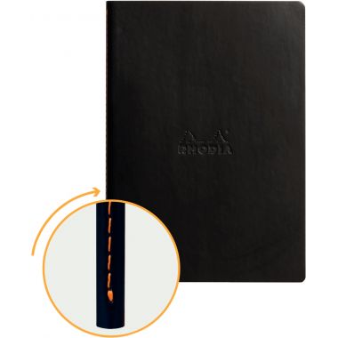 Carnet piqué 64 pages RHODIARAMA format A5, ligné, noir. Format A5 (14,8x21 cm). Papier vélin velouté ivoire 90g. Couverture souple en simili cuir italien avec logo Rhodia embossé et piqûre textile orange cousue main. Page de garde orange. Ouverture à plat 180°.