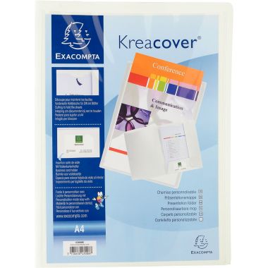 Chemise de présentation personnalisable 2 rabats KREACOVER en polypropylène 4/10ème, blanc. Format 24x32 cm pour documents A4. 2 rabats intérieurs clipsés. Languette intérieure pour maintien des documents. Personnalisable en 1ère de couverture. Encoches pour cartes de visite.
