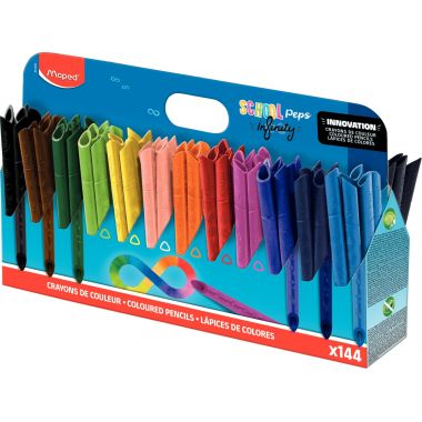 Classpack de 144 crayons de couleur Infinity. 100% mine tendre et résistante. Forme triangulaire. Ils durent en moyenne 10 fois plus longtemps. Pas besoin d’être taillés, ils s’auto affutent en coloriant. Texture Douce et agréable à l‘usage. Couleurs super lumineuses. Zéro déchet. Longueur du crayon : 11,5cm