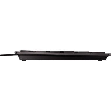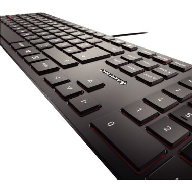 Clavier filaire Cherry KC6000 slim couleur noir. - Compact, plat, design et silencieux. - LED d’état intégrées aux touches majuscule, verrouillage numérique et défilement. - 6 touches de raccourci (verouillage de la session, internet, calculatrice + 3 touches multimédia). - Très robuste, grâce à sa plaque de métal intégrée et ses patins antidérapants. - Touches résistantes à l'usure Garantie 3 ans.