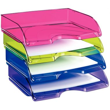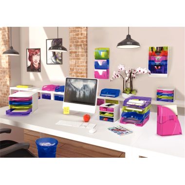 Corbeille à courrier à l'italienne HAPPY bleue. Large ouverture à l’avant permettant de saisir très facilement les documents contenus. Accepte jusqu’au format 24 x 32 cm. Se superposent verticalement ou « en escalier ». Compatible avec l’ancien modèle. Dimensions Hors Tout : 341 x 265 mm H 65,4 mm. En polystyrène antichoc très robuste, 100% recyclable