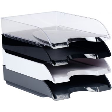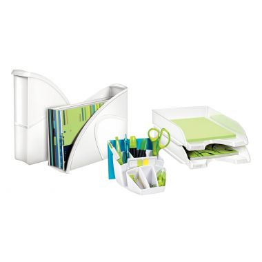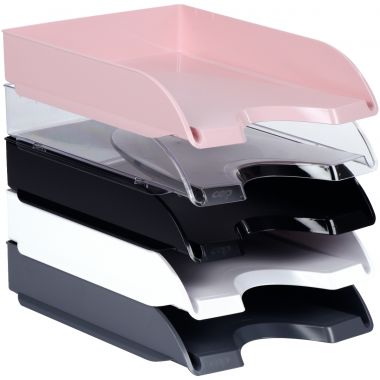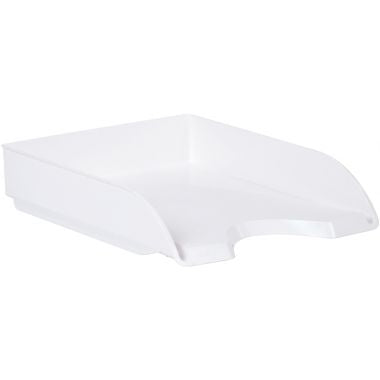 Corbeille à courrier RIVIERA blanche. Avec son design élancé, cette corbeille trouvera sa place sur tout style de bureau. Elle accepte les documents jusqu?au format 24 x 32 cm et les pochettes à élastique. Pratique, sa large ouverture à l?avant vous permet de saisir très facilement les documents contenus. Ces corbeilles se superposent verticalement ou « en escalier». En polystyrène antichoc très robuste et 100% recyclable. Dimensions 348 x 257 H 66 mm