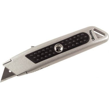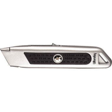 Cutter métal auto-rétractable avec grip. Bi matière.La lame rentre automatiquement dans son logement dès que l'opérateur relâche le poussoir.Pour droitier et gaucher
