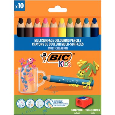 Étui de 10 crayons Bic multi surface assortis + 1 taille-crayon.
