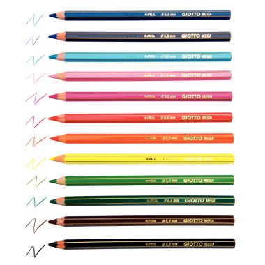 Étui de 12 crayons de couleur Méga assortis. Mine résistante au bris. Couleurs vives. Diamètre de la mine : 5,5mm Diamètre du crayon : 9mm. Longueur 18cm.
