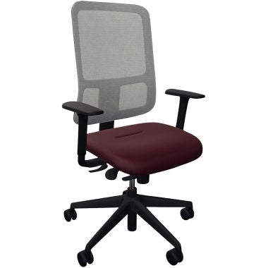 Fauteuil Early Mesh dossier gris/assise bordeaux. Mécanisme synchrone FS. Réglage en intensité de la force du dossier en fonction du poids de l'utilisateur. Dossier débrayable et multi blocable 5 positions (angle) et réglable en hauteur sur 70 mm et 7 positions. Résille noire 100% polyester (non feu) tendue sur cadre dossier polyamide. Réglage de l'assise en hauteur par vérin oléopneumatique. Assise rembourrée revêtue de tissu 100% polyester recyclé non-feu allumette Cigarette EN 1021.1 et 2. Label Oeko Tex 100. Mousse d’assise injectée : 40 kg/m3 épaisseur 50 mm. Structure interne de l'assise en hêtre multipli. Paire accoudoirs réglables 2D en hauteur sur 7 cm et largeur sur 30 mm de chaque côté – Support polyamide noir – Manchettes en mousse de PU aspect « soft touch ». Piétement en nylon avec roulettes freinées pour sols polyvalents : sol dur & moquette Ø 60 mm. Garantie 5 ans.
