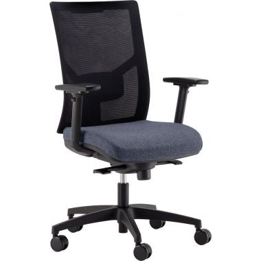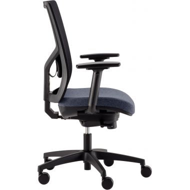 Fauteuil Eleganze dos noir/assise bleu. Mécanisme synchrone blocable 4 positions. Translation d'assise 70mm. Support lombaire réglable. Assise en mousse injectée densité 60kg/m3 épaisseur 45mm. Assise: L50xP45.5cm. Hauteur d'assise réglable de 46.2 à 59.5cm. Pour utilisateur jusqu'à 110kg. Garantie 5 ans.