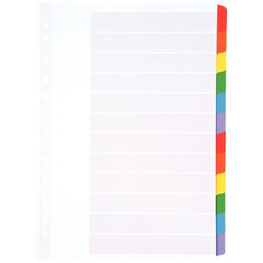 Jeu de 12 intercalaires en carte Mylar, format A4. Intercalaires en carte blanche 150g avec touches neutres multicolores et perforations renforcées Mylar. Livré avec un sommaire neutre en bristol.