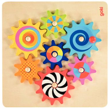 Jeu des engrenages en bois, 7 roues. Encastrement original constitué d'1 plateau et de 7 roues dentées en bois multicolore à positionner sur les tiges du plateau pour former un engrenage en mouvement avec effets visuels kaléidoscope. Une seule combinaison possible pour animer le manège. Repérage visuel sur le plateau pour guider l’enfant et modèle pas à pas au dos du plateau. Permet de comprendre le lien de cause à effet en s'amusant. Dimensions du plateau : L.21 x l.21 cm. Dès 3 ans.