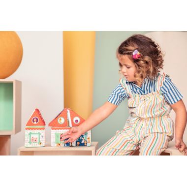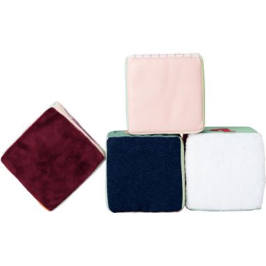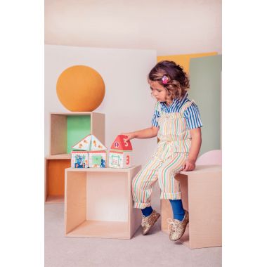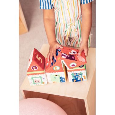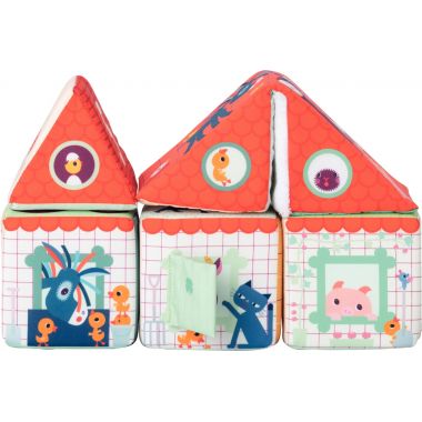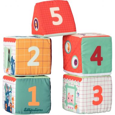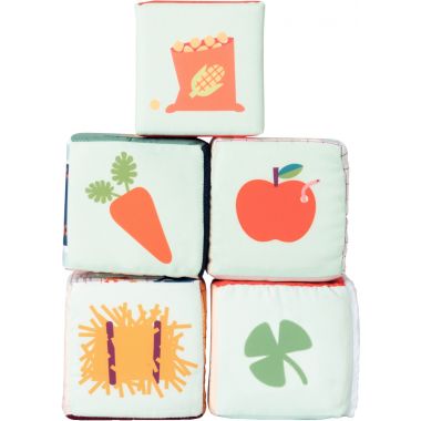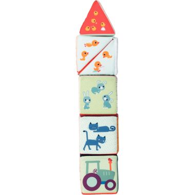 La ferme des cubes à empiler LILLIPUTIENS. 5 cubes d'éveil en tissu doux et rembourré sur le thème de la ferme. A empiler ou à aligner avec un défi de chaque côté : une ferme à reconstituer, les chiffres de 1 à 5, un tracteur et des animaux à compter, différentes matières à toucher, 5 animaux de la ferme à observer et leurs aliments. Le cube n°4 se déplie et le cube n°5 représente le toit de la ferme. Stimule l'attention et la curiosité des tout-petits, développe le vocabulaire et apprend à compter jusqu'à 5. Pour jouer sans faire de bruit. Rembourrage recyclé. 100% polyester, lavable en machine à 30° cycle délicat. Coté d'un cube : 9 cm. Dès 12 mois.