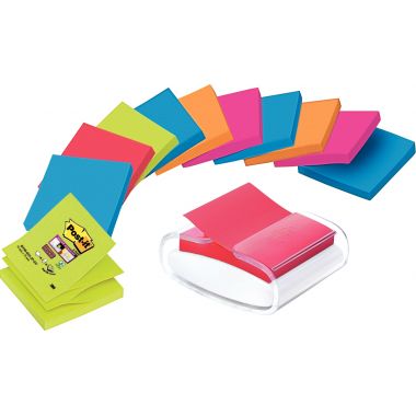 Lot de 12 blocs de 90 feuilles z-notes post-it super sticky repositionnables 76 x 76 mm couleurs assorties + dévidoir pro blanc offert