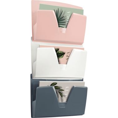 Lot de 3 corbeilles murales Minéral . Lot de 3 corbeilles murales pour documents jusqu’au format 24 x 32 cm et A3 (enveloppes très larges, tubes postaux) grâce aux échancrures sur les côtés. Ouverture évasée sur la paroi avant assurant une excellente préhension des documents, même de petite taille (cartes de visite, enveloppes commerciales). Paroi arrière pleine garantissant un confort d'utilisation, la main ne frotte pas sur le mur lors de la saisie du contenu. Identification facile du contenu : 6 étiquettes adhésives vierges fournies. Les corbeilles peuvent se fixer séparément ou en « grappe » (système de clipsage l'une à l'autre). Kit de fixation fourni. Capacité utile d’une corbeille : 340 feuilles A4 (80 g), 326 x 31 H 240 mm. Supporte jusqu’à 2,5 kg dans une corbeille seule et 5,5 kg dans trois corbeilles accrochées en grappe. Garantie : 5 ans.