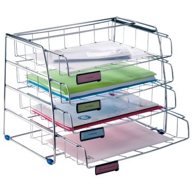 Lot de 4 corbeilles courrier à l'italienne métal chromé. Corbeilles coulissantes jusqu'au format 24x32cm. Portes-étiquettes amovibles en plastique noir pour classer tous les documents. Patins antidérapants pour une grande stabilité. Métal Mesh ultra résistant et solide. Dimensions : L.39 x P.31.5 x H.31.5cm.