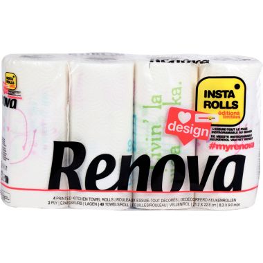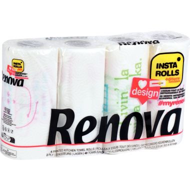 Lot de 4 rouleaux essuie-tout RENOVA Design 2 plis. 40 feuilles par rouleau. Dimensions d'une feuille : 21.2 x 22.8cm