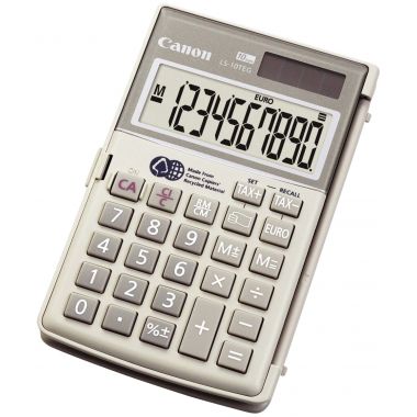 Machine à calculer de poche CANON écologique LS-10TEG. Créée pour les entreprises et les particuliers soucieux de l'environnement, la calculatrice de poche à affichage 10 chiffres de Canon avec fonctions de calcul de taxe et de conversion en euros est fabriquée à partir de matériaux Canon recyclés à hauteur de 20%. Caractéristiques : - Tous les boîtiers et les étuis sont fabriqués avec des matériaux de copieurs Canon recyclés. - Double source d'alimentation : énergie solaire et pile remplaçable. - Fonctions de calcul de taxe et de conversion en euros. - Grand écran LCD. - Étui de protection à rotation de 360°. - Mise hors tension automatique pour une économie d'énergie supérieure. Dimensions : 122 x 78 x 14 mm. Poids : 92 grammes. Garantie : 3 ans.