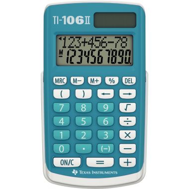 Machine à calculer de poche scolaire Texas TI-106II. La première calculatrice conçue pour l’école primaire ! CP, CE1, CE2, CM1, CM2. - Calculatrice 4 opérations conçue pour l’école primaire - Écran 2 lignes pour visualiser le calcul et son résultat en même temps - Robuste avec son capot protecteur - Facile d’utilisation grâce à la très bonne lisibilité des chiffres et des touches - Alimentation mixte solaire/pile LR1130 Dimensions : 125 x 70 x 15 mm. Poids : 73 grammes. Garantie : 3 ans