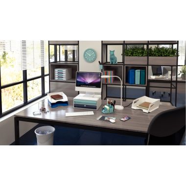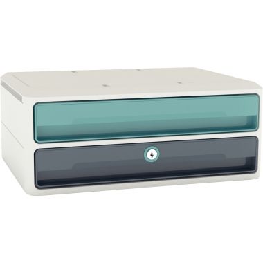 Module 2 tiroirs MOOVUP gris/vert d'eau. En polystyrène résistant. Module agile pour répondre à l'évolution des modes de travail. Facilement transportable avec ses 2 poignées. Muni d'une serrure qui verrouille l'ensemble des tiroirs. Ultra robuste, peut servir de support d'écran.