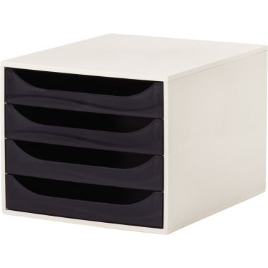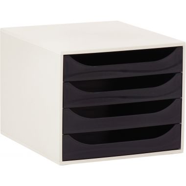Module 4 tiroirs ECOBOX gris/noir. Réalisé à partir de bouteilles de jus de fruits recyclées. - Caisson individuel à 4 tiroirs au format A4+. - Tiroirs ouverts permettant l’introduction directe de documents sans ouvrir les tiroirs. - Coulissement parfait des tiroirs, avec butée de sécurité - Proportions idéales pour votre bureau.