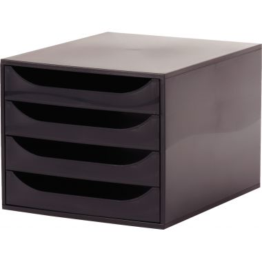 Module 4 tiroirs ECOBOX noir/noir. Réalisé à partir de bouteilles de jus de fruits recyclées. - Caisson individuel à 4 tiroirs au format A4+. - Tiroirs ouverts permettant l’introduction directe de documents sans ouvrir les tiroirs. - Coulissement parfait des tiroirs, avec butée de sécurité - Proportions idéales pour votre bureau.