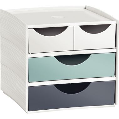 Module 4 tiroirs MYCUBE Riviera. Idéal pour rassembler et ranger tous vos petits accessoires et fournitures : téléphone portable, stylos, clé USB, agrafeuse, post-it ®… Maxi capacité et mini encombrement sur votre bureau. Tiroirs équipés de poignées ergonomiques et de butées d’arrêt en fin de course. Tiroirs amovibles et interchangeables selon vos envies. Plusieurs modules peuvent être superposés pour créer un espace de rangement sur mesure. Patins antidérapants fournis.