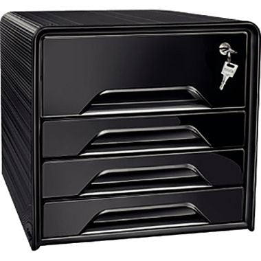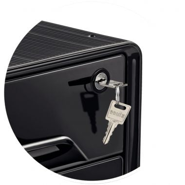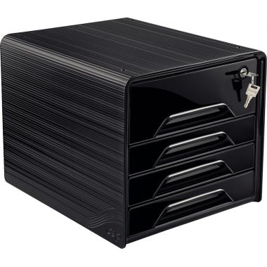 Module 4 tiroirs SMOOVE sécure noir. Caisson monobloc ultra robuste. Finition texturée en relief, contemporaine et raffinée. Conforme à la règlementation RGPD, le tiroir du haut se ferme à clé pour protéger les documents confidentiels et objets personnels. Capacité utile : 2 tailles de tiroirs acceptant jusqu'au format 24 x 32cm. Maxi tiroir H 85mm, tiroirs standards H 40mm. Tiroirs équipés de poignées ergonomiques et d’un trou de préhension pour faciliter la saisie du contenu (sauf sur le tiroir équipé d'une serrure). Coulissement parfait avec butée d’arrêt en fin de course. Livré avec patins antidérapants et étiquettes d’indexation.