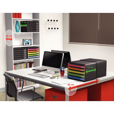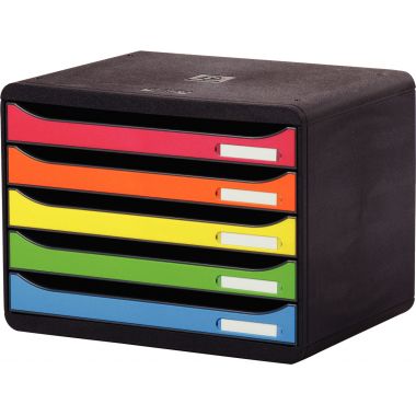 Module 5 tiroirs BIGBOX+ à l'italienne noir/arlequin. Caisson indivisuel à 5 tiroirs pour documents au format A4+ Format à l'italienne (paysage) : idéal pour les espaces peu profonds de certains bureaux, armoires ou étagères (profondeur hors tout de xxcm) Classement parfait des documents imprimés au format paysage (tableur par exemple) Superposable grâce à 4 reliefs prévus à cet effet Tiroirs ouverts permettant l'introduction directe de documents sans ouvrir les tiroirs Coulissement parfait des tiroirs, avec butée de sécurité et porte-étiquette (fournis) Fourni avec un jeu d'étiquettes "Lundi à Dimanche"