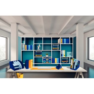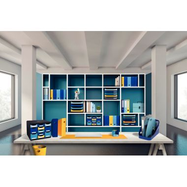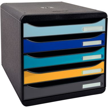 Module 5 tiroirs BIGBOX+ Beeblue. Caisson individuel à 5 tiroirs pour documents au format A4+. Monobloc, ultra-rigide. Superposable grâce à 4 reliefs prévus à cet effet. Tiroirs ouverts permettant l'introduction directe de documents sans ouvrir les tiroirs. Coulissement parfait des tiroirs, avec butée de sécurité et porte-étiquettes (fournis). Fourni avec un jeu d'étiquettes Lundi à Dimanche.