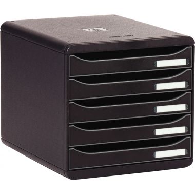 Module 5 tiroirs BIGBOX+ noir. Caisson individuel à 5 tiroirs pour documents au format A4+.- Certifié Ange Bleu car réalisé à partir de bouteilles de jus de fruits recyclées.- Monobloc, ultra-rigide.- Superposable grâce à 4 reliefs prévus à cet effet.- Tiroirs ouverts permettant l'introduction directe de documents sans ouvrir les tiroirs.- Coulissement parfait des tiroirs, avec butée de sécurité et porte-étiquettes (fournis).- Fourni avec un jeu d'étiquettes "Lundi à Dimanche".Garantie 25 ans