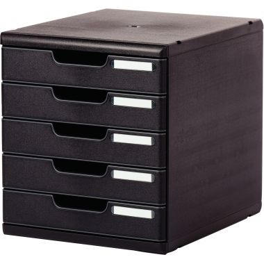Module 5 tiroirs MODULO noir. Système de classement élégant et fonctionnel pour documents au format A4+.- Modules de hauteur identique à celle d'un classeur à levier, superposables et juxtaposables (MODULO A4 & A3 combinables).- Évolutif grâce à 4 hauteurs de tiroirs (26, 54, 82 & 110 mm) interchangeables 4/3/2/1.- Coulissement parfait des tiroirs, avec butée de sécurité, poignée confortable et porte-étiquette.- Livrés avec tous les clips et obturateurs nécessaires au montage et à la finition.Certifié Ange Bleu car réalisé à partir de bouteilles de jus de fruits recyclées.Garantie 25 ans