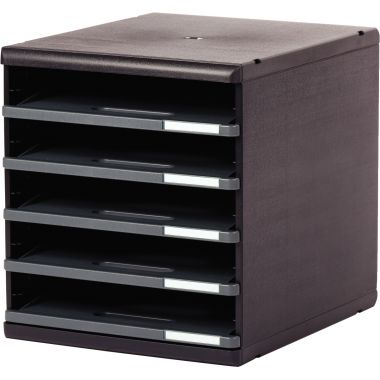 Module 5 tiroirs ouverts MODULO noir. Système de classement élégant et fonctionnel pour documents au format A4+.- Modules de hauteur identique à celle d'un classeur à levier, superposables et juxtaposables (MODULO A4 & A3 combinables).- Tiroirs ouverts permettant l'introduction directe de documents sans ouvrir les tiroirs.- Coulissement parfait des tiroirs, avec butée de sécurité, poignée confortable et porte-étiquette.- Livrés avec tous les clips et obturateurs nécessaires au montage et à la finition.Garantie 25 ans