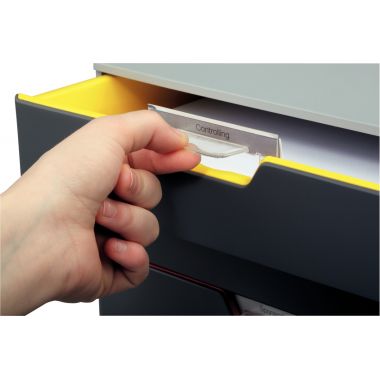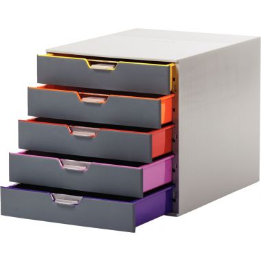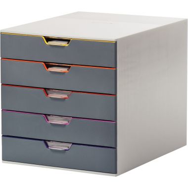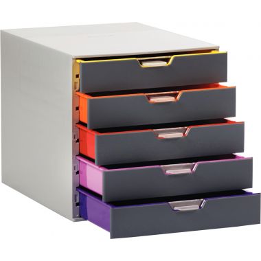 Module 5 tiroirs VARICOLOR. Module de classement, en plastique ABS, équipé de 5 tiroirs pour le classement de documents aux formats A4, Folio et enveloppes. Les différentes couleurs aident à l'organisation et au repérage, même lorsque les tiroirs sont fermés. Les tiroirs se coulissent parfaitement et silencieusement et sont équipés d'une butée d'arrêt. Les modules sont superposables et juxtaposables pour un gain de place dans les coffres et armoires. Patins antidérapants. Livré avec porte-étiquettes et insertions imprimables, pour faciliter le classement.Dimensions (H x L x P) : 292 x 280 x 356 mm
