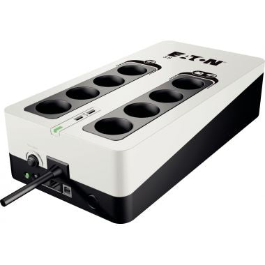 Onduleur EATON 3S 850 F - 850 VA / 510 Watts USB. La gamme Eaton 3S deuxième géneration (Gen2) assure une protection efficace des équipements multimédias et informatiques, aussi bien en milieu professionnel que résidentiel. Protection contre les principaux problèmes électriques • L’onduleur Eaton 3S Gen 2 assure la protection efficace de vos équipements vis à vis d’événements fréquents, tels que les surcharges du réseau électrique et les orages, qui perturbent le secteur sans prévenir. • En cas de panne secteur, le 3S fonctionne sur batterie et vous laisse un temps suffisant pour sauvegarder votre travail en cours. • Pour plus de sécurité, le logiciel d’arrêt, fourni avec l’onduleur, enregistre automatiquement vos données et ferme vos applications avant que vos batteries ne soient épuisées. • Un disjoncteur thermique de 10A protège l’installation de toute surcharge. • Le 3S Gen 2 protège à la fois les prises électriques et les lignes de données RJ11/xDSL contre les surtensions, grâce à un dispositif parafoudre haute performance compatible au standard international IEC 61643-1