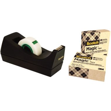 Pack dévidoir C38 noir + 3 rouleaux Magic Green. Dimensions : 19mm x 33m. Ruban complètement invisible après application, il le restera au fil du temps. C'est l'outil idéal pour les finitions soignées ou les travaux professionnels : réparer sans laisser de traces sur des documents déchirés, assembler des feuilles de papier, afficher des notes ou des pense bêtes, faire des montages à photocopier... Ne se déchire pas au déroulement, se déroule en douceur et sans bruit, indétectable à la photocopie. Permet l'écriture, ne jaunit pas. Film fabriqué à partir de matières naturelles. Emballage 100% recyclé. Sans solvant, adhésif à base de plantes. Bague en plastique recyclé. Dévidoir lesté en plastique recyclé.