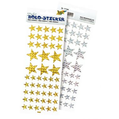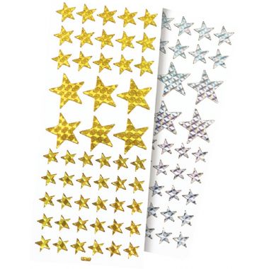 Paquet de 102 gommettes étoiles holographiques or et argent. 3 tailles : 1,2, 1,9 et 3,2 cm. Contient 2 planches : 1 planche de 51 étoiles or et 1 planche de 51 étoiles argent.