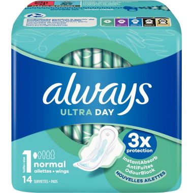 Paquet de 14 serviettes hygiéniques avec ailettes. Always ultra jour normal plus. Le système InstantAbsorb éloigne l'humidité, prévient les fuites et éloigne les odeurs. Nouvelles ailettes.