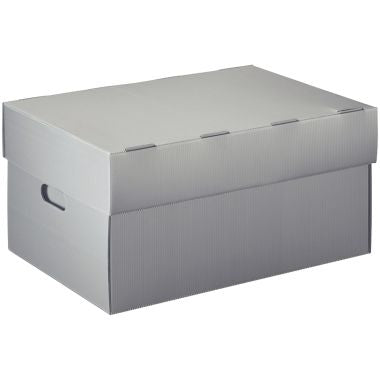 Paquet de 5 containers d'archives en polypropylène. Container en polypropylène alvéolé 100% recyclable, pouvant contenir : 5 boîtes d'archives dos de 10 cm ou 6 boîtes d'archives dos de 8 cm, ou 7 classeurs à levier. Poignée de préhension avec contre-partie évitant les intrusions de rongeurs. Fermeture par couvercle amovible. Ne craint pas l'humidité ni les rongeurs. Avantages : Résiste à la superposition, couvercle amovible permettant un ajustement du couvercle en fonction de la hauteur des produits contenus. Couvercle renforcé. Articles livrés à plat, couvercles et fonds. Montage très simple. Coloris : gris métal. Format intérieur : 515 x 360 x 265 mm. Format extérieur : 545 x 380 x 270 mm. Par caisse de 5