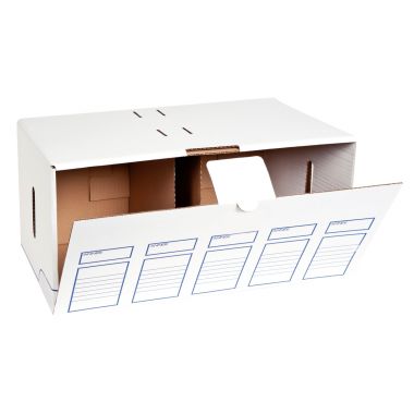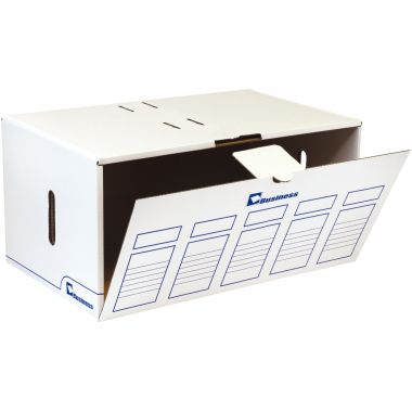 Paquet de 5 containers ouverture frontale MBUSINESS. Peut contenir 5 boites de 10cm ou 6 boites de 8cm.Le fond se forme par une simple pression.Equipé de 2 poignées de transport pour une manipulation aisée.Livré avec cloison de renfort.Dim. intérieures : L.55,2 x H.26,7 x P.34,2 cm.Livré à plat.